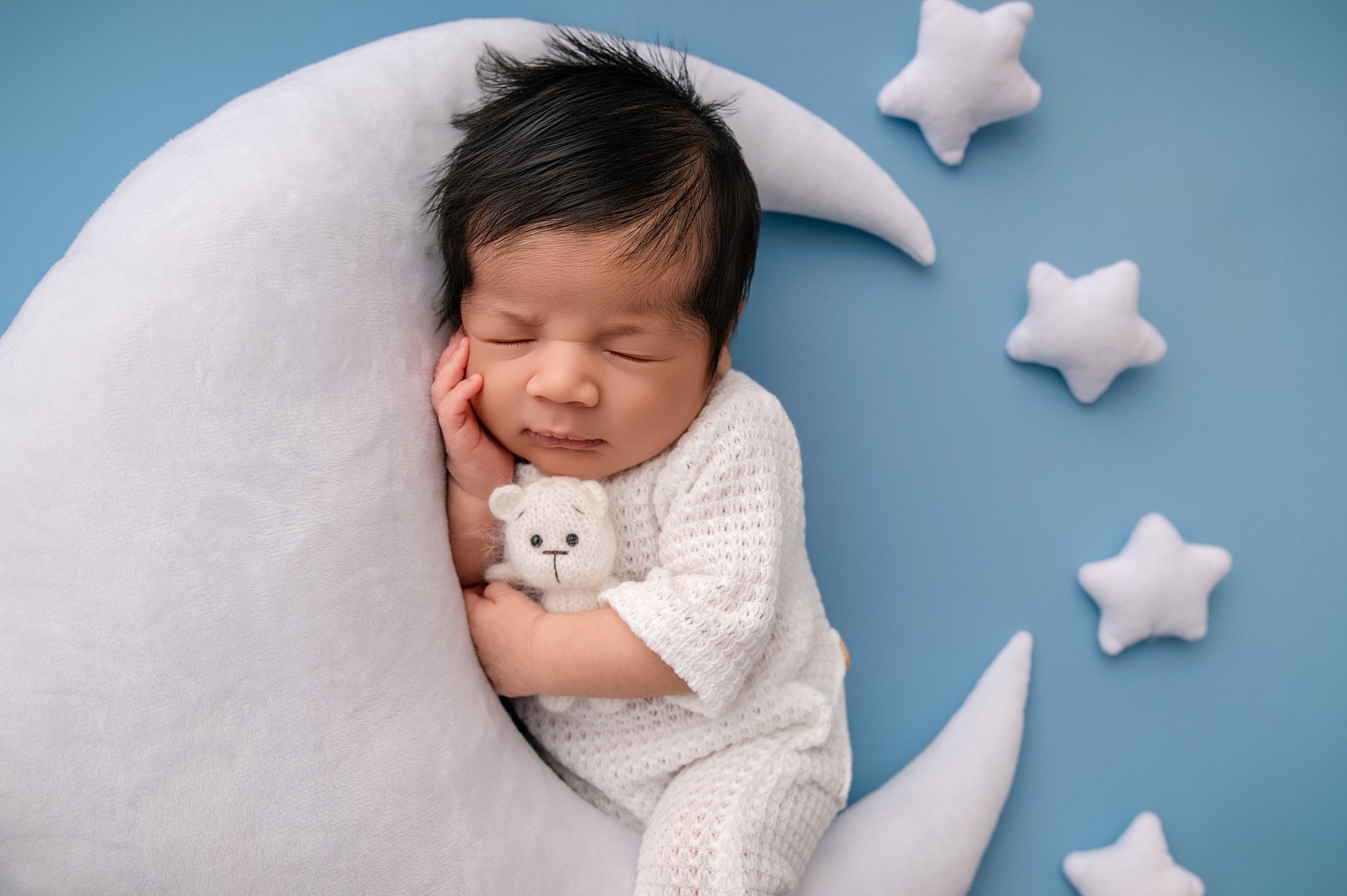 Enjoy a polished and peaceful newborn photography session where every detail is handled with care — from styling to baby-led posing — so you can relax and savor the moment.