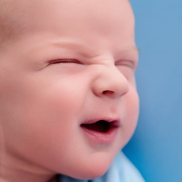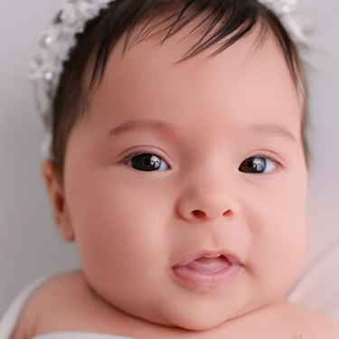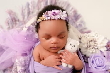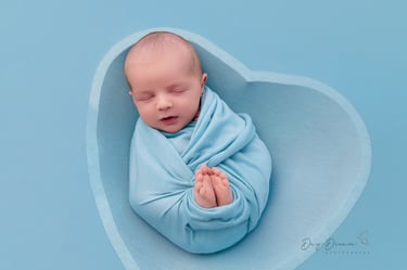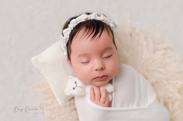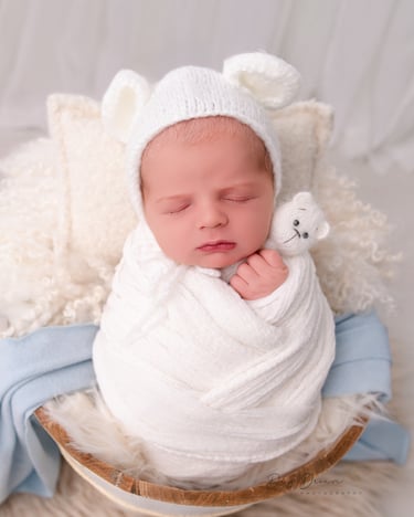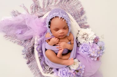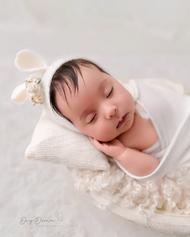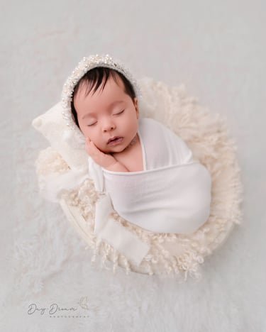 A classic newborn favorite! Baby is gently posed in a padded bucket with cozy layers, creating an upright, snug look. Perfect for highlighting sweet little faces with a dreamy, soft backdrop.